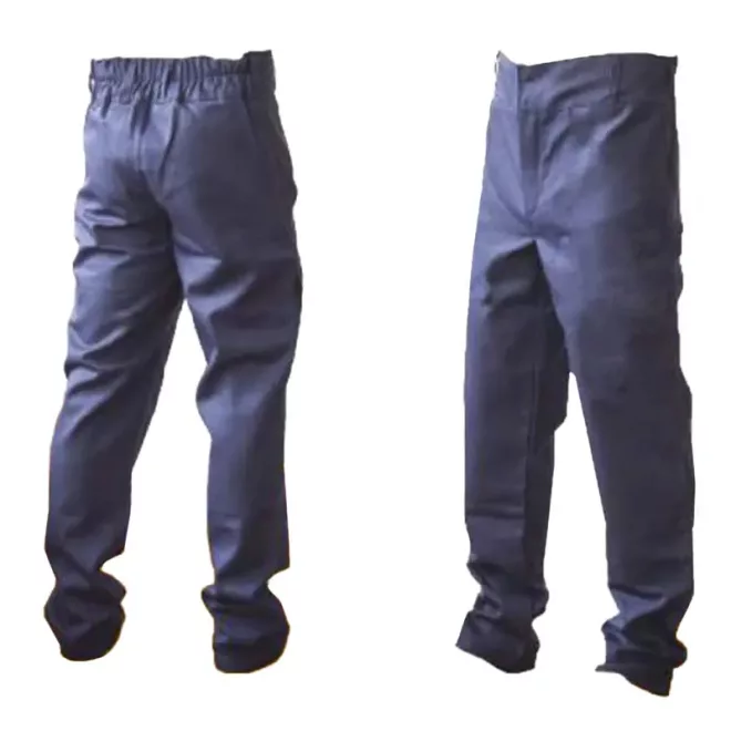 Gumírozott derékrész, rejtett gombolópántos záródással, 2db rejtett, belső tasakos csípőzseb (oldalvarrás vonalából kialakítva), nagyméretű térdfolt, mely combhajlattól kezdődően boka-lábszár közötti szakaszig takar, a védőruhán a szabványban rögzítetteknek megfelelően NEM található perem, mely mind a röppenő szikrák- és fröccsenő vegyszerek védelmére szolgál