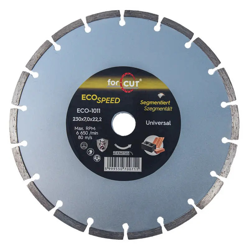 A For Cut ECO-1011 típusú, szegmentált éllel rendelkező gyémánt vágókorong általánosan előforduló építőanyagok vágására használható és standard sarokcsiszolókon alkalmazható.