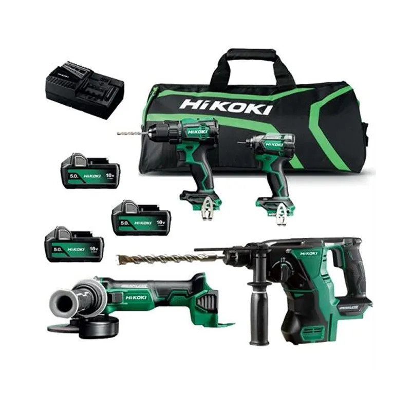 Hikoki akkus DS18DE fúró-csav.+ WH18DC fúró-ütvecsav.+ G1813DA sarokcsisz.+ DH1826DA fúrókalapács3x5Ah akku+töltő+sporttáska gépcsomag, KC18DEWHZ