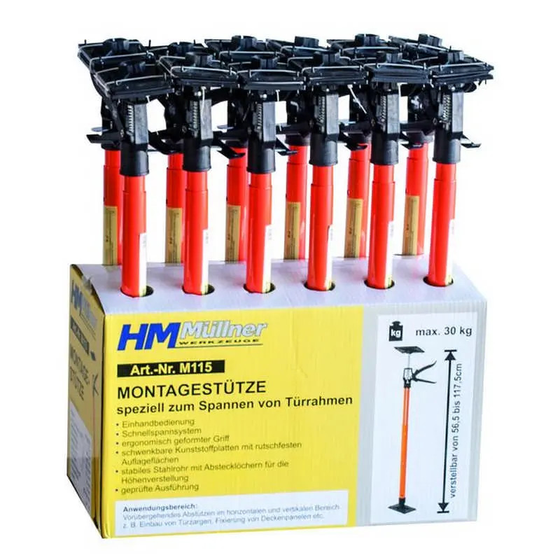 Gipszkarton építéshez pl. ajtókeretek beszerelésekor Univerzális munkasegéd ideiglenes alátámasztáshoz és rögzítéshez vízszintes és függőleges területeken 57-118 cm között állítható Könnyű kezelhetőség a gyorskioldó rendszernek köszönhetően Ergonomikus kialakítású fogantyú Elfordítható, csúszásmentes műanyag panelek csúszásmentes támasztófelülettel Lejtőkön is használható (max. 45°) Stabil acélcső lyukakkal a magasságállításhoz Tulajdonságok: