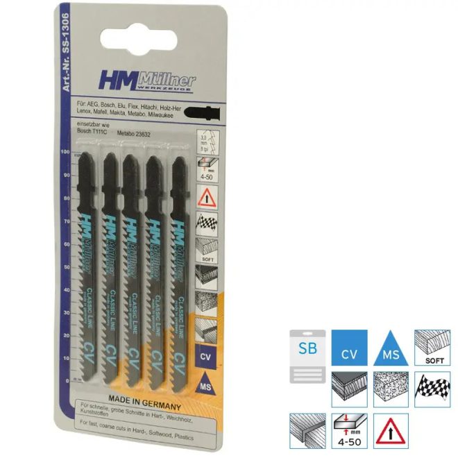 HM Müllner dekopírfűrészlap, szúrófűrészlap CV, 5db/csom 100x75x3x8x8x1,25mm Vágási vastagság 4-50mm