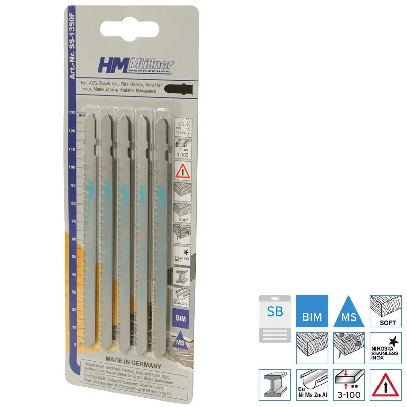 HM Müllner dekopírfűrészlap, szúrófűrészlap HSS-BI-metal 5db 132x110x1,8-2,5x10-14x8x1,27mm Vágási vastagság 3-100mm, inox, Fém/acél, színesfémek/alumínium