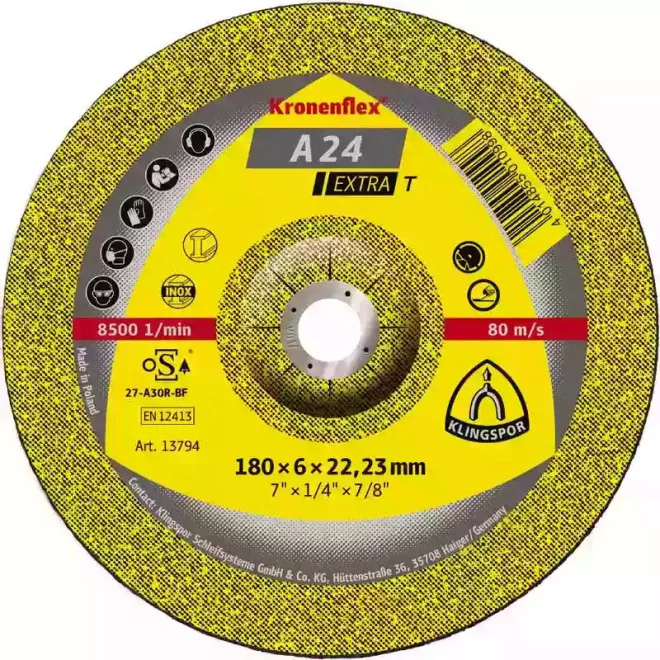 Klingspor tisztító, csiszolókorong 180x6x22,2mm domborított-A 24 EXTRA T-általános fém, 13794