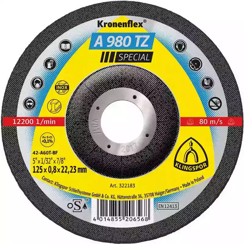 Klingspor vágókorong 125x0,8x22,2mm domborított-A 980 TZ SPECIAL-inox,acél,színes fém, műanyag boxban, 322183