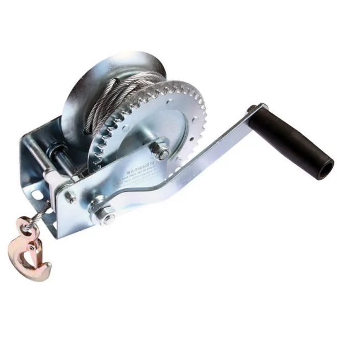 Kézi kötélcsörlő. Vonóerő 450 kg, acélkötél hossza 8 m. A csörlőt terhek vontatására tervezték, pl. pótkocsikon. A szerkezet és a felületkezelés ellenáll a kedvezőtlen időjárási viszonyoknak.