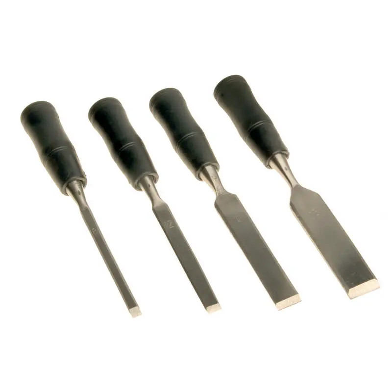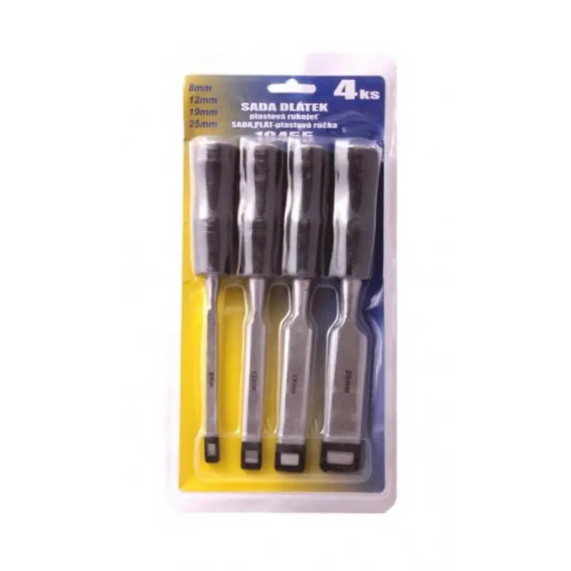 4 db 8, 12, 19, 25 mm-es vésőkészlet hobbi használatra, ergonomikus műanyag nyéllel, felütő felülettel.
