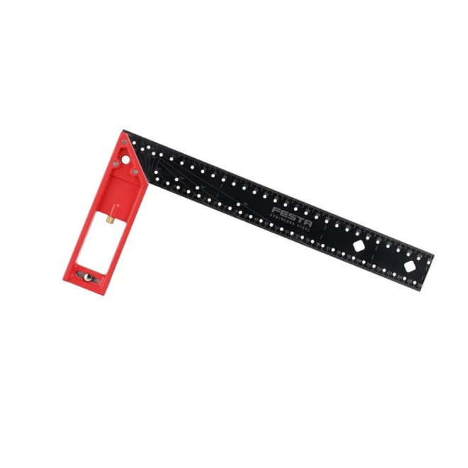 Professzionális többfunkciós ácsderékszög. Pontos skála jelölőnyílásokkal - jelzett szögek, távolságok széles körű felhasználáshoz, méréshez, jelöléshez különböző felületeken, mint fa, fém, műanyag stb. Speciális kiegészítők - kihúzható támaszték és hegy a speciális jelölésekhez - körök, hosszanti vonalak stb. Alkalmas profiknak, valamint igényes barkácsolóknak és modellezőknek