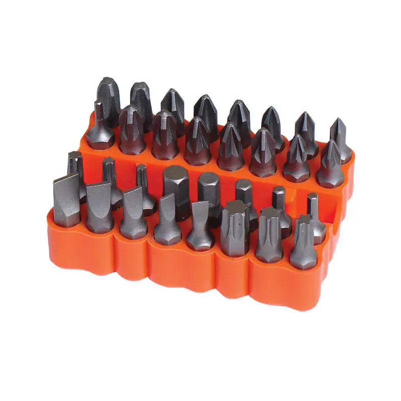 Bitkészlet, 33db-os, műanyag rendező tárolóval, levehető fedéllel a bitfejek védelméért. S2 króm-vanádium acélból készült behajtófejek a tartósság érdekében.