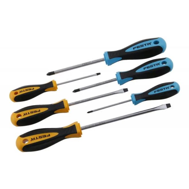 Professzionális FESTA csavarhúzó készlet ipari használatra. A test S2 acélból - ötvöző elemekkel kezelt acél - króm, szilícium, mangán, molibdén, vanádium. Mágnesesen edzett hegy a könnyebb csavar illesztésekért.