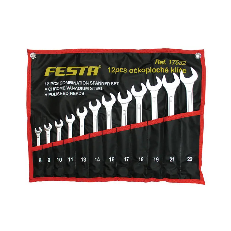 A FESTA villáskulcs készlet egy kis műanyag rendezőt tartalmaz egy papírdobozban. A villáskulcsok kiváló minőségű króm-vanádium