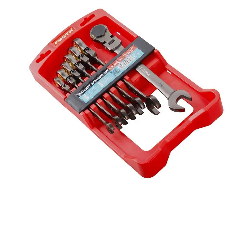 FESTA csuklós, racsnis csillag-villáskulcs készlet szögben történő munkavégzéshez, CrV - króm-vanádium acélból (ezüstacél) kovácsolva a DIN3113 szerint. 72 fogas racsnival, mely Cr-Mo acélból készült, és csukló mechanizmussal. Az acél felületkezelése "fekete nikkel" lézergravírozással, az optimális felületi keménység és a korrozív hatásokkal szembeni ellenállás elérése érdekében.