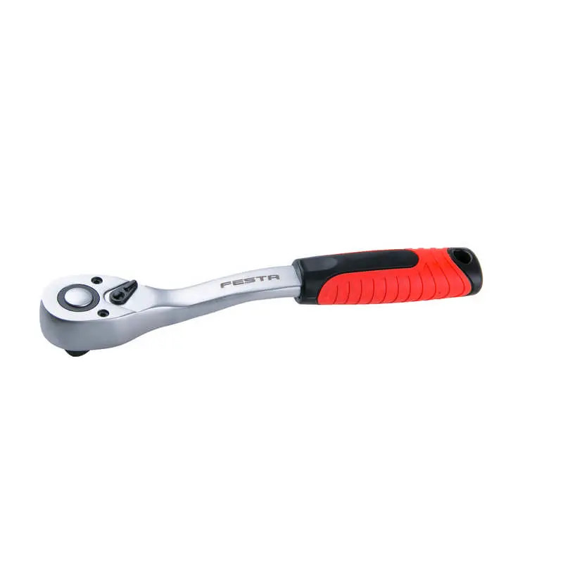 Festa professzionális króm-vanádium acél racsnis hajtókar. Lekerekített testforma a könnyebb munkavégzés érdekében munkadarab és felhasználói sérülés nélkül. Racsnis mechanizmus edzett, Cr-Mo (króm-molibdén) acélból, 72 fogas racsnival. 5 ívlépcsős kapcsolással a racsni mozgásirányának váltására - meghúzás/lazítás, gyorskioldó gombbal a dugókulcs cseréjéhez.