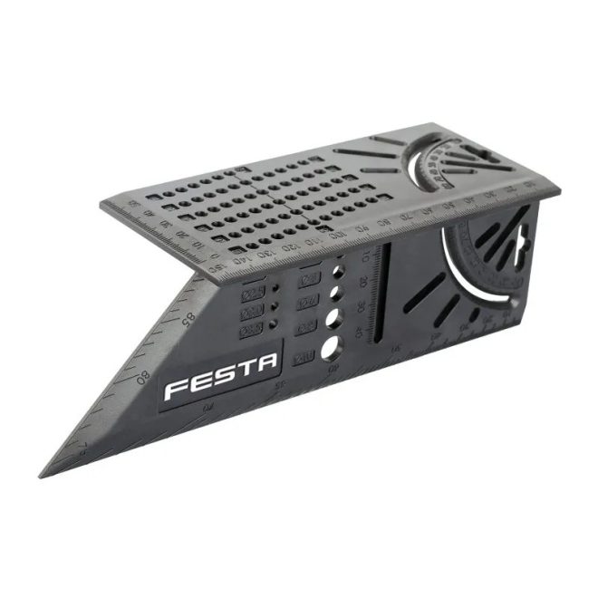 professzionális multifunkcionális asztalos szög. Méretjelölések, speciális kivágások és jelzett szögek széles körű felhasználáshoz, igazításhoz, jelöléshez és famegmunkáláshoz, fémekhez, műanyagokhoz stb. Alkalmas szakemberek és barkácsolók számára. A termék kiváló minőségű és tartós műanyagból készült. A termék alakja és geometriája pontos mérést tesz lehetővé a sarkokban, és ideális a ferdeszögek pontos átviteléhez a feldolgozott anyag két szomszédos oldalára.