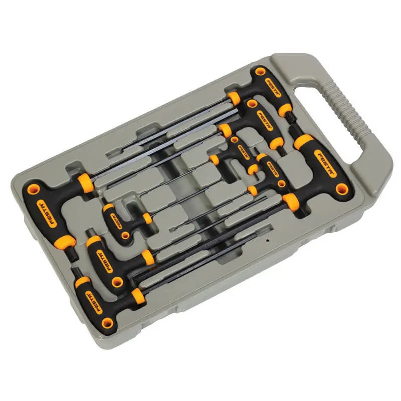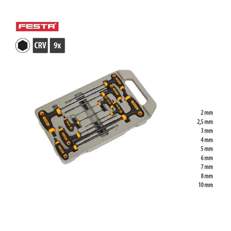A leggyakrabban használt méretű FESTA hatszögletű kulcsok (imbuszkulcsok) készlete műanyag-gumi, két komponensű, ergonomikus T fogantyúval, csúszásmentes felülettel, CrV, végig edzett acélból, praktikus műanyag tokba csomagolva. A puha, ergonomikus fogantyú kényelmes és egyszerű használatot biztosít.