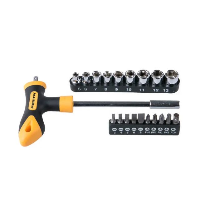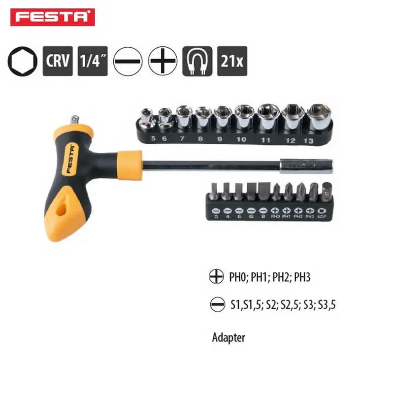 FESTA T csavarhúzó készlet bitekkel 20db-os készletben. Minőségi CrV acél alkatrészek, befogó tengely - hatszög 1/4" mágnessel és egy négyzet alakú 1/4"-os fejekhez biztonsági golyóval.