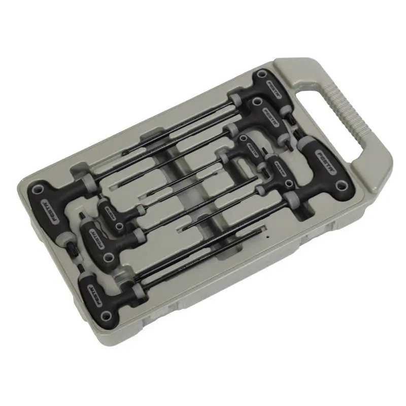 A leggyakrabban használt méretű FESTA torx kulcsok készlete, műanyag-gumi, két komponensű, ergonomikus T alakú fogantyúval, csúszásmentes felülettel. CrV, végig edzett acélból, praktikus műanyag tokba csomagolva. A puha, ergonomikus fogantyú kényelmes és egyszerű használatot biztosít.