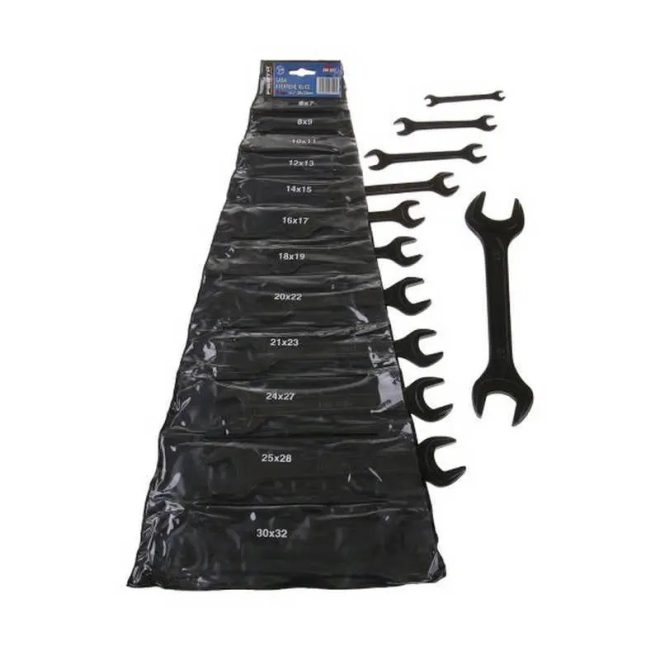A kulcskészlet minőségi króm-vanádium acél vasalatból készült, fekete felületű, műanyag tekercses tokban.