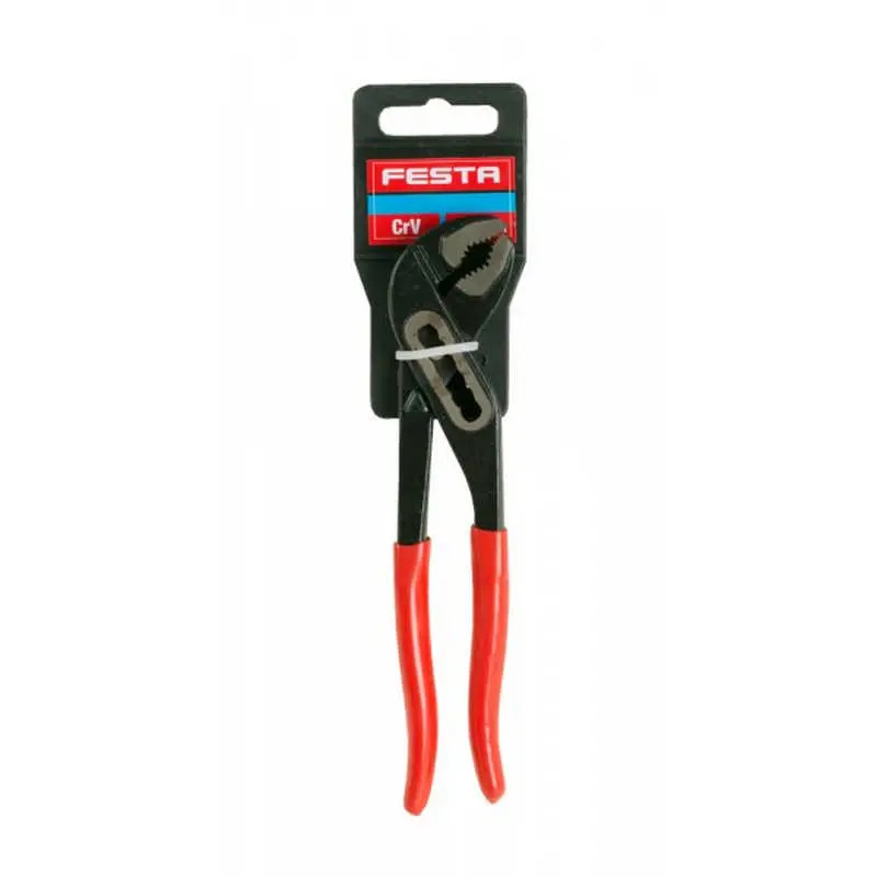 FESTA vízpumpafogó Erős és tartós fogó, amely króm-vanádium acélból (CRV) készült, tömör kovácsolásból. A kívánt pofatávolság gyorsan és pontosan beállítható. Kiváló minőségű edzett CrV acélből (ezüstacél), lágyított csúszásmentes bevonattal ellátott fogantyúk a jobb munkavégzés érdekében. Állkapocs alakú köszörült fogakkal, anyákhoz és csövekhez egyaránt. Az indukciósan edzett fogazott fogófelület még a sima csöveken is biztos fogást biztosít.