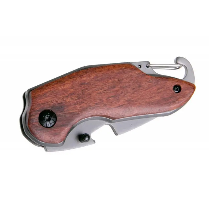 a markolatban karabiner kulcsra, láncra stb. akasztható, a pengében kivágás sörnyitóként használható.