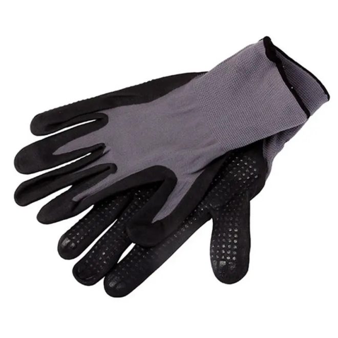 Szürke kötött puha nejlonból, minőségi nitrilhabba mártott tenyérű kesztyű, célpontokkal a tenyéren, CE EN 388, 10-es méret.