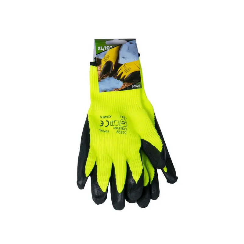 Kötött varrat nélküli akril kesztyű, durva tenyér, fekete latexhabba mártva, téli, CE EN 388, 10-es méret.