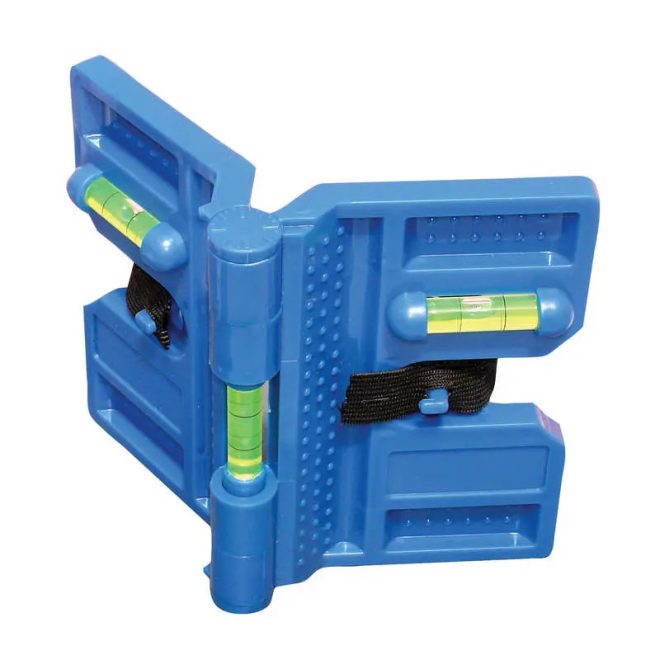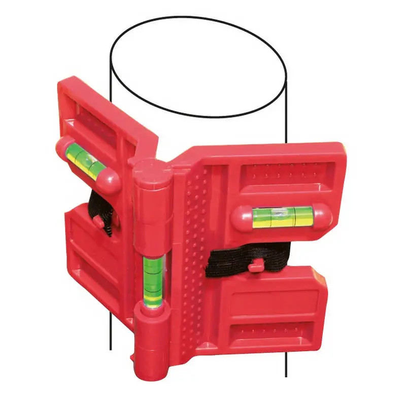 Szárnyoszlopos vízmérték három fiolával. Elasztikus szalaggal faoszlopokhoz vagy műanyag csövekhez és ragasztómágnesekhez való rögzítéshez.