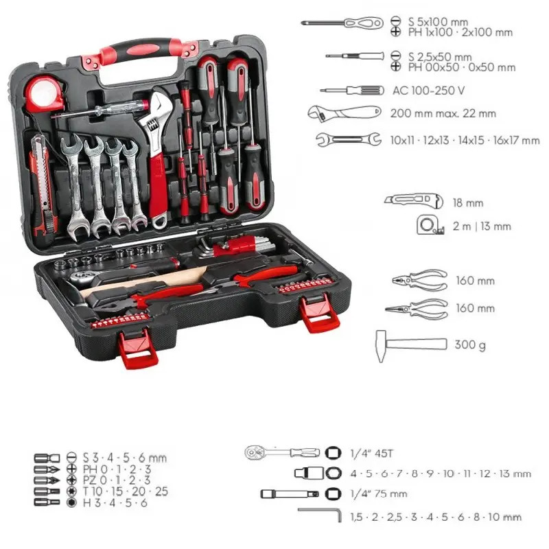 - egy univerzális szerszámkészlet a leggyakrabban használt eszközökkel, amelyek nem hiányozhatnak egyetlen háztartásból sem