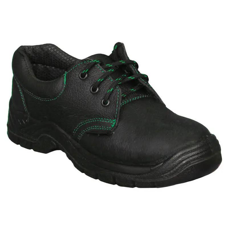 Olajálló, antisztatikus, kétrétegű PU talp, bőr felsőrész, acél orrmerevítő. S2 védelmi szint. Bokánál szivacsos. Zöld varrással. Csúszásbiztos. EN ISO 20344, EN ISO 20345
