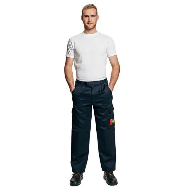Férfi antisztatikus ,hő- és lángálló nadrág pamutból tartós lángálló kezeléssel; övbújtatós derékpánttal. 2 belső zseb, 2 oldalzseb, 2 hátsó tépőzáras, hajtókás zseb, megerősített térd- és üleprész. EN 1149-5:2008, EN531:95/A1:98