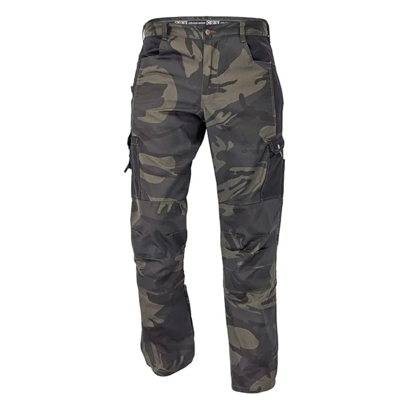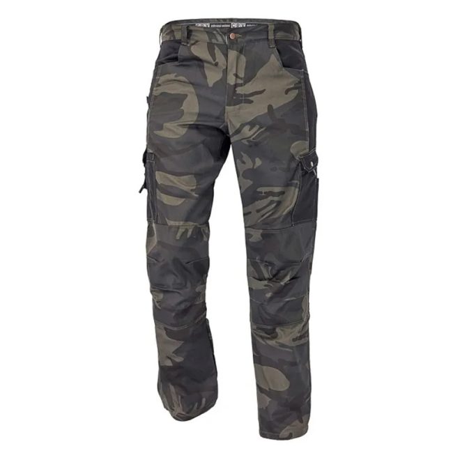 Könnyű férfi nadrág. Funkcionális zsebekkel: 2 oldalt, 2 cargo, 2 farzseb. Terepmintás.