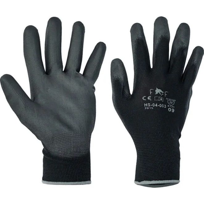 Kötött PES kesztyű PU mártott tenyérrel, rugalmas mandzsettával.