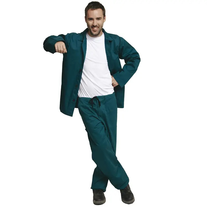 Gombbal záródó dzseki 2 oldalzsebbel és 1 mellzsebbel; Húzózsinóros derékkal készült nadrág 2 oldalzsebbel és 1 hátsó zsebbel; 100 % pamut, 200 g/m²