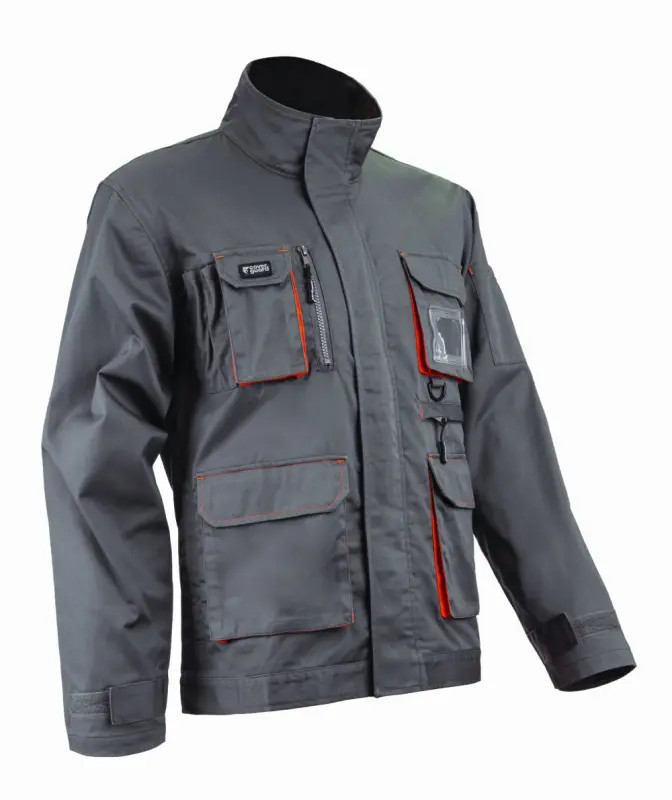 Szürke szín, narancs díszítéssel ellátott dzsekifazonú kabát állítható mandzsettával. Rejtett állig érő húzózárral és magas álló gallérral rendelkezik. Véd a szennyeződésektől.