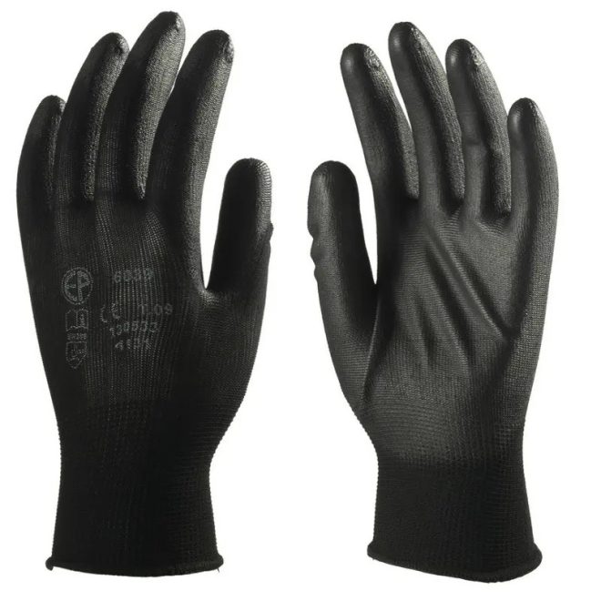 6040- MV fekete precíziós/szerelő poliészter szerelőkesztyű, PU mártott tenyérrel 10