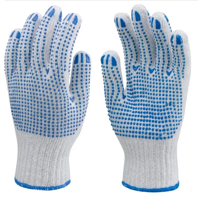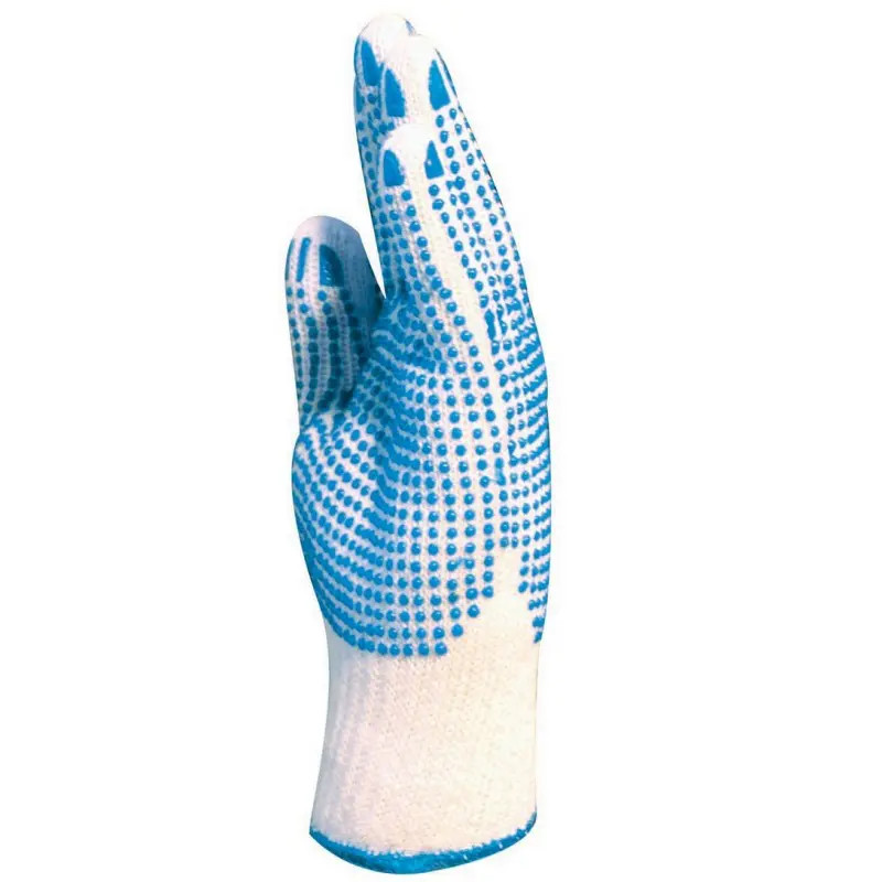 MV kötött PES/pamut fehér cérnakesztyű, két oldalon kék pettyek 9