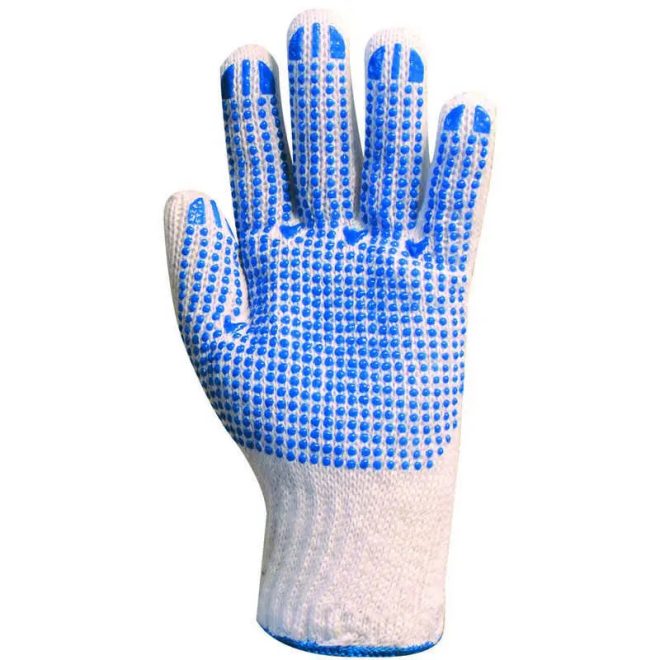 MV kötött PES/pamut fehér férfi kesztyű, tenyerén kék pettyek 9