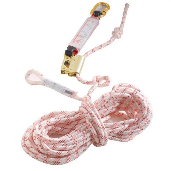 - 71354: 20 m hosszú, 12 mm átmérőjű, körszövött kötél, felfűzött zuhanásgátló, energiaelnyelő, csavarmenetes karabiner (71110)