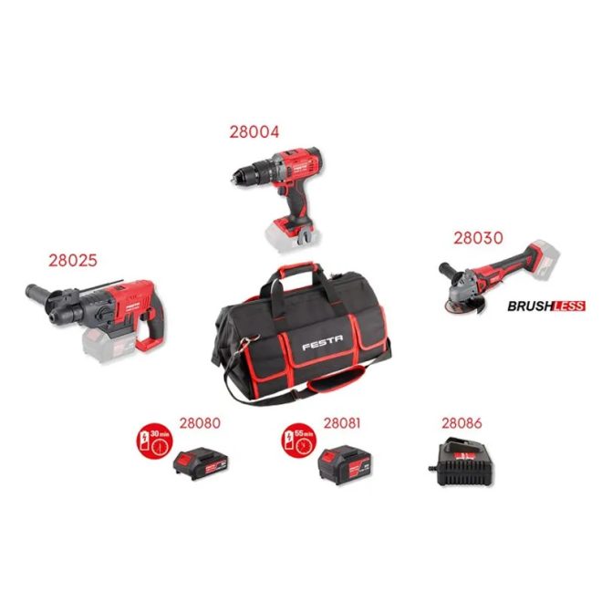 Lev FESTA akkus szett táskával (28004 - ütvefúró-csavarozó, 28025 - fúrókalapács, 28030 - sarokcsiszoló(125mm), 28080 - 2Ah akku, 28081 - 4Ah akku, 28086 - akku töltő 4,0A), 28102